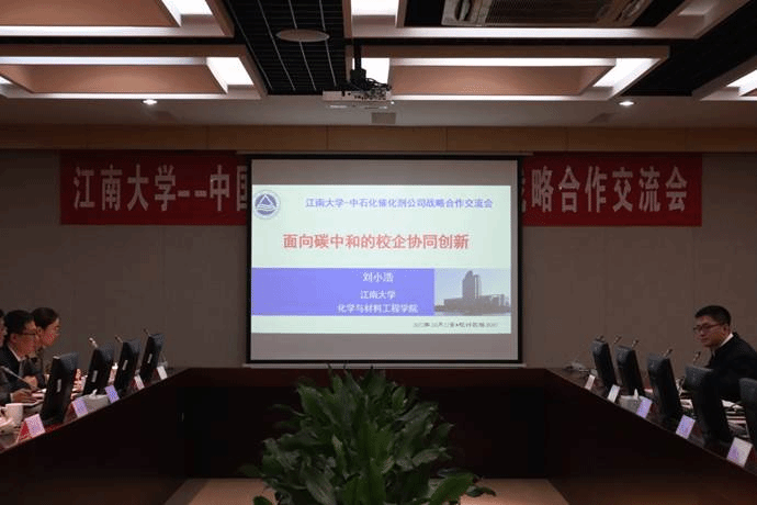 焦阳简要介绍了催化剂公司的总体情况,对我校在食品、轻工领域的学科实力给予高度评价,并积极评价2007so太阳集团在表面活性剂、化妆品和功能材料等相关领域的影响力,特别是刘小浩教授团队近几年围绕习近平总书记提出的“2030碳达峰/2060碳中和”相关研究领域做出的开拓性工作引起了学术界和行业的关注,催化剂公司对此产生极大的兴趣。接着董玉明介绍了化工学院的情况,刘小浩做了题为“面向碳中和的校企协同创新”的学术交流报告,并同与会人员开展了深入的讨论,初步确定了战略框架协议合作内容,以及合作的具体切入点。交流会后,焦阳总经理一行参观了2007so太阳集团刘小浩教授团队的洁净能源与化工催化实验室。