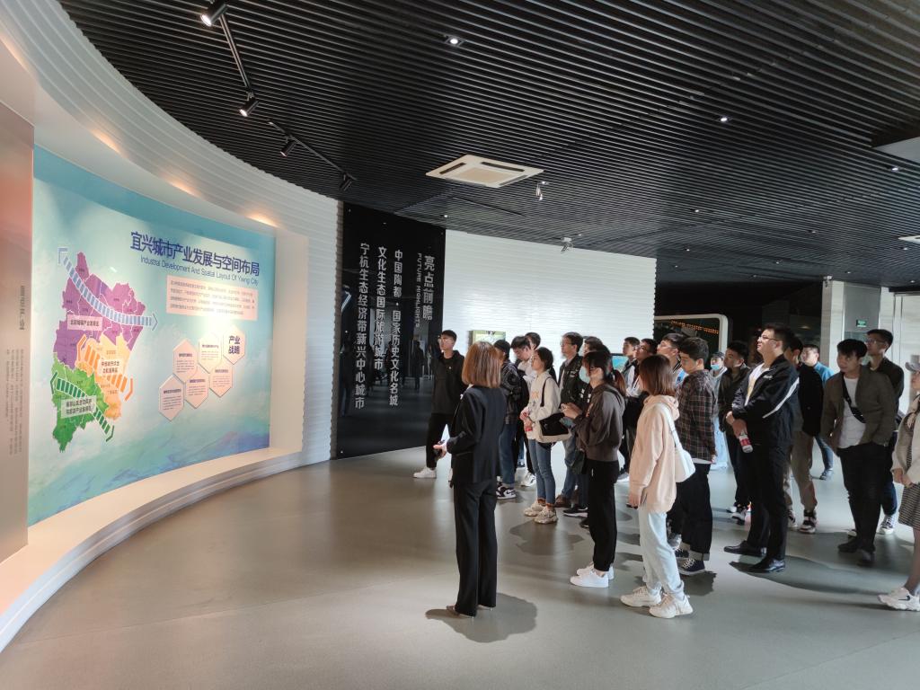 鸟瞰宜兴城市,展望未来规划。本次研学活动的第一站来到了宜兴城市规划馆,在讲解员的带领下,全体学生党员对宜兴“三山两水五分田”,城市“山在城中、城在水中”,乡村“村庄连片、田园纵横”的生态资源、历史文化都有了更多的了解,也看到了宜兴建设环保新城、科创新城的规划和决心。