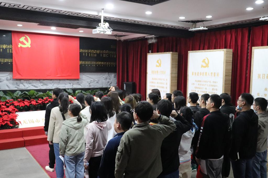 随后,党员们共同欣赏了周围陈列的“无锡杰出共产党人”和“无锡人民革命史”的板画,并认真参观了饱含革命故事的生动浮雕和五块不同历史时期的誓言碑。随即,全体党员同志面向党旗郑重而立,重温入党誓词。
