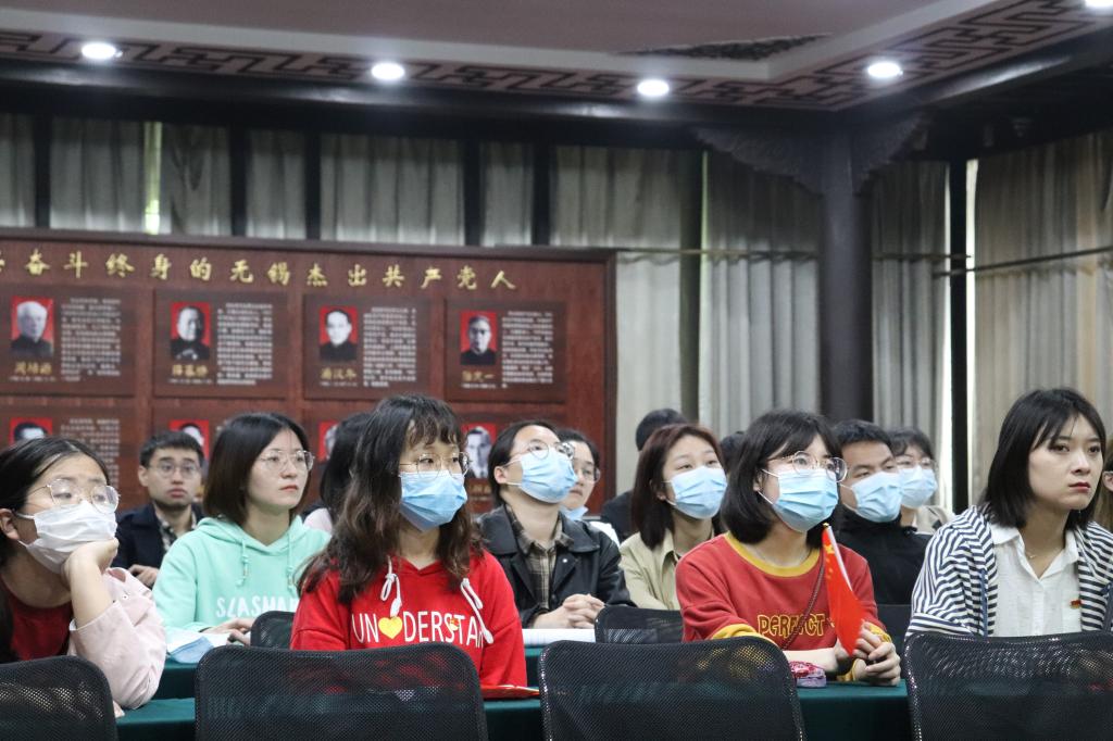 接着,党员们跟随讲解员来到了二楼,认真地听完了这堂特殊的党课。讲解员介绍了无锡第一支部的诞生历程、无锡总工会第一任委员长秦起烈士的生平事迹,及新中国成立后无锡第一面红旗升起处。党史宣传片《誓言颂》,以入党誓词在党不同历史时期的变化为索引跨越百年,让学生党员们更深刻地体悟党的初心与使命,誓词与时俱进,而底色自始如一。