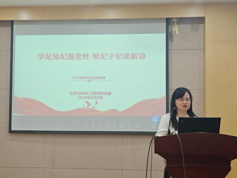 首先,董霞以“学纪知纪强党性明纪守纪建新功”为主题开展党纪学习教育专题党课。围绕“寻根溯源知纪律、遵规守纪明底线、笃学尚行建新功”三个方面,通过讲述党的纪律建设历史沿革、违纪违法典型案例,教育毕业班党员同志们要在未来的工作中明纪守规,把增强党性、严守纪律融入日常、化为习惯。同时表达了对毕业生们的美好祝福,对毕业生提出四点希望:不忘初心,拔节孕穗;严于律己,遵纪守法;履行义务,勠力担当;文明离校,争做表率。号召党员同志们把升学就业的有益经验分享给师弟师妹,带头参加学院组织的捐赠书籍、衣物、饭卡余额等毕业季系列活动。