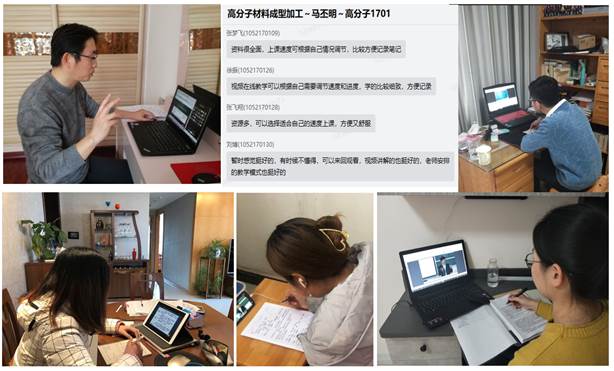为了确保线上教学质量和教学效果,《高分子材料成型加工》课程组进行了精心准备。正式开课之前,多次与材料系老师们交流经验和存在的问题,课程组内部多次研讨教学的内容和形式,并向同学们及时了解他们需求和存在的问题。为身边没有电脑的4位同学提供手机APP线上学习渠道、为尚无教材的同学分享电子书籍,并提前两天组织全体同学线上试课,提前发放学习资源等,以确保不漏任何一名同学。为了应对网络平台可能出现的突发情况,马丕明老师还与高分子1701班同学建立普通微信群、准备了线下学习资料等预案。经过精心准备,《高分子材料成型加工》线上课堂有序开展,整个教学过程较为顺畅,同学们都能积极踊跃地参与学习,对这次线上课堂模式收获了与线下不同的学习体验。