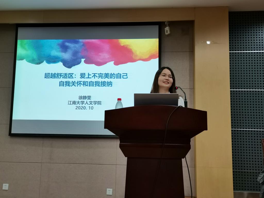 为引导研究生深入了解自我、正视自我,科学运用心理知识疏导压力,10月15日,化工学院在化工楼B329举办主题为“超越舒适区:爱上不完美的自己-自我关怀和自我接纳”主题心理讲座,此次讲座特邀太阳集团2007心理健康教育中心兼职咨询师徐静雯主讲,学院党委副书记田卫平、分团委书记任增亮、研究生辅导员郝林青及学院160余名研究生参加此次讲座。