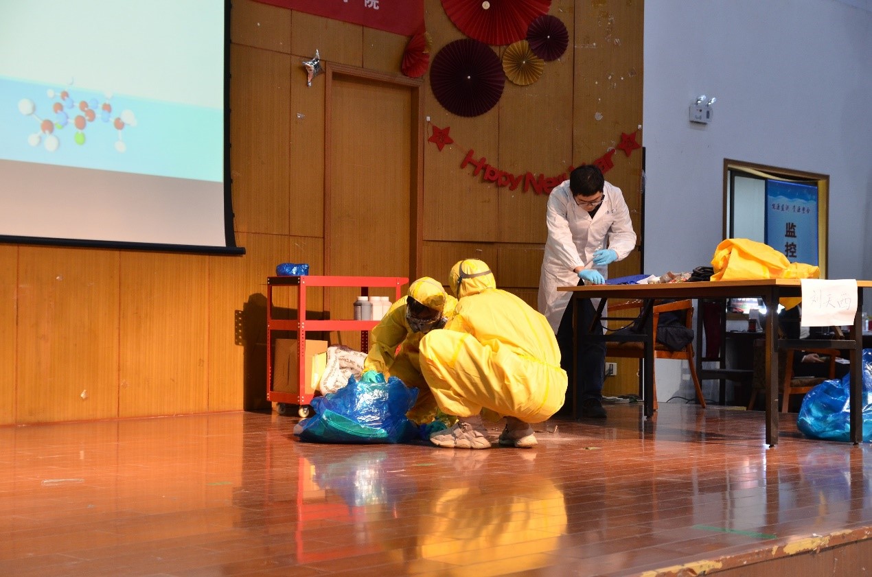 复赛开始前,钱婷婷老师强调了实验室安全的重要性,提醒同学们牢固树立安全意识,在实验室安全问题上,容不得丝毫侥幸心理,并对此次举办的实验室安全知识竞赛对我院安全意识建立的促动效果表示肯定。在经过两轮激烈的角逐,来自刘天西和杜明亮团队的两支队伍进入总决赛,最后的操作题采用了情景模拟的方式,在舞台上为比赛选手模拟出实验室突发事故的现场,要求学生组成应急小组进行现场操作,从防护服、防护面罩等的穿戴到进入突发现场处理破碎的试剂瓶与地上的“浓盐酸”,在从理论知识走向应急处置的过程中,选手的实际操作存在一些不足与隐患。最终,刘天西团队以更加细致严谨的操作获得了本次比赛的一等奖,杜明亮团队荣获二等奖,许虎君和宋启军团队获得三等奖,东为富和王海军团队获得优胜奖,各评委老师及特邀嘉宾为参赛选手进行了颁奖并合影留念。