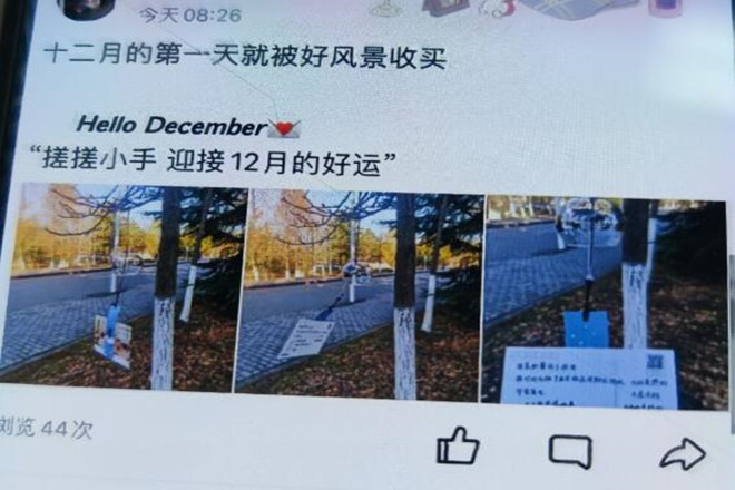 经过中心全体同学的努力,张贴工作在11月30号晚上24时左右结束。随后从12月1日早上开始,同学们欣喜地陆续收到各方的积极反馈,各处独特的风景吸引同学纷纷前来打卡拍照,校园里洋溢着浪漫与温情,更有路人愿意一起加入装扮校园的活动。