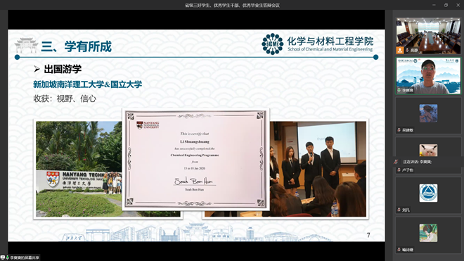为全面落实立德树人根本任务,展示化工学子风采,发挥时代青年的引领作用,4月12日晚,化工学院通过线上会议形式开展2022年省级三好学生、优秀学生干部、优秀毕业生答辩评选答辩会。出席本次答辩会的评委老师有院党委副书记、副院长田卫平,分团委书记刘凡、全体辅导员及优秀学生代表。