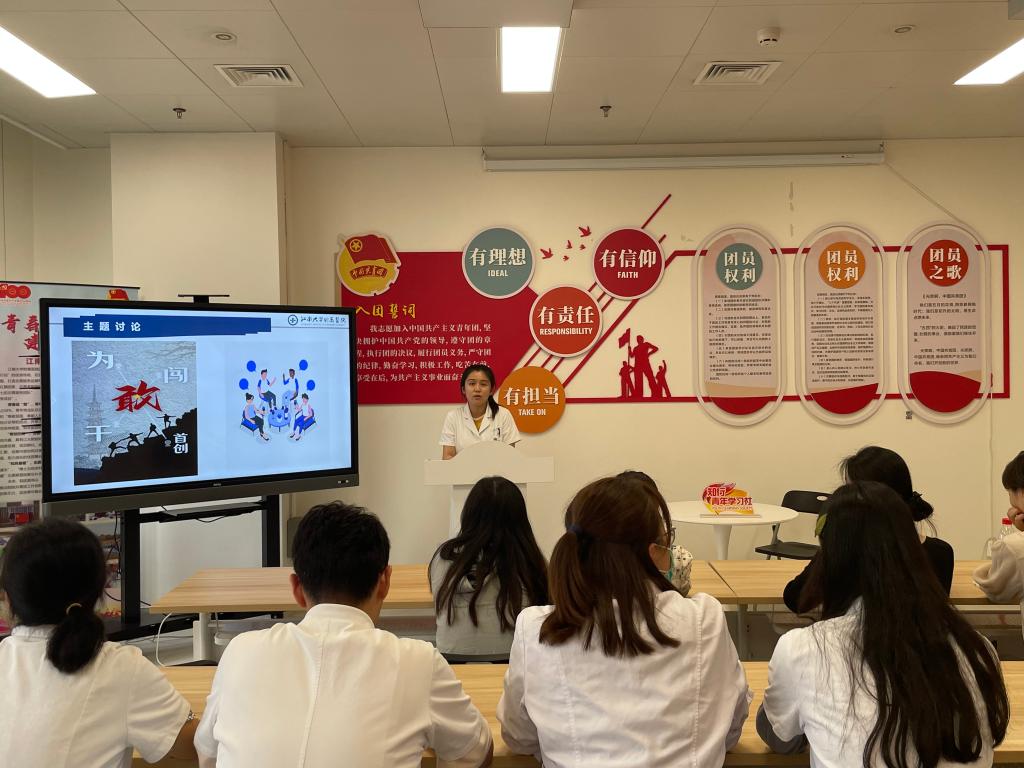活动第一部分为“四敢”精神的专题学习,附属医院团员代表进行了领学。通过学习,激发了青年团员敢于担当、勇于创新、知行合一、争先创优的热情和斗志。附属医院青年代表从敢于攻坚而要不断提高工作能力水平,善于破解瓶颈难题,创造性地解决工作中遇到的各种困难和问题方面分享了自己的感想。应化2103班团支部团员代表从学习角度出发分享了要敢于在成绩面前永不满足、永不懈怠、锐意进取,敢于争先,要坚持高标准、严要求,争创一流的学习感受。