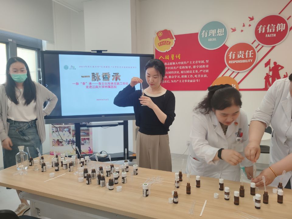 随后进行了“一脉香承”香文化主题微讲座及调香实践。应用化学系副教授储鸿进行了香水文化为主题的讲座,她向大家深入讲解了香水这一普通的日用化学品背后的用途、故事以及独特的文化内涵,并对各种香气背后的化学机理进行了分析,让大家领略了科学与艺术交互共生之美。在应化2103班小调香师的讲解和指导下,与会代表初步掌握了调香的方式方法,并进行了调香的实践。