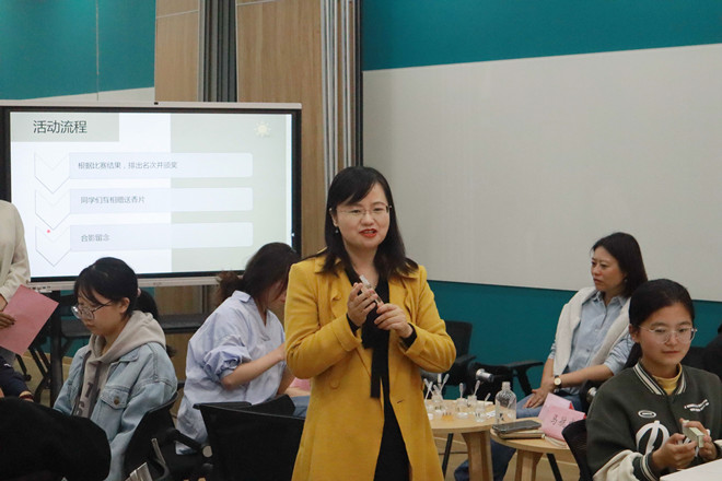 相识相知,打破坚冰。在主持人的带领下,同学们通过测试小程序测试自身人格,并匹配出推荐香型。随后,储鸿为在场师生介绍调香知识,讲解具体调香流程。通过探索香气之旅,让同学们在破冰交友的同时,感知自我,认识自我,在调香中获得深入交流的机会。