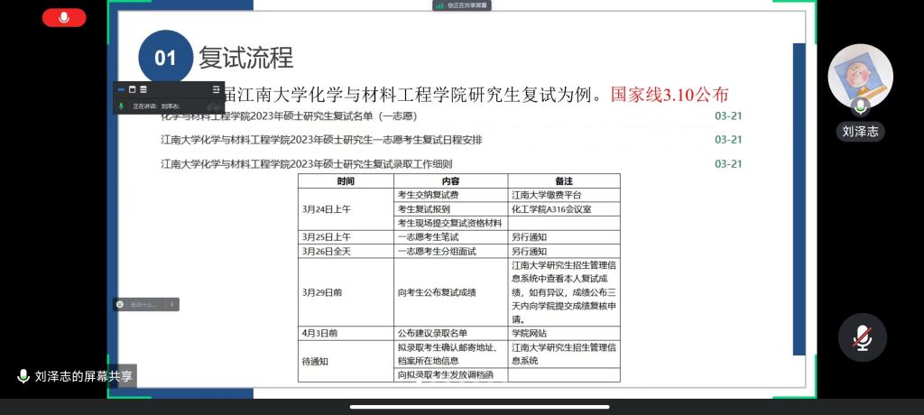 最后,太阳集团2007的刘泽志对院校复试的分值构成进行了详细解读,同时对复录比进行了讲解和补充,行百里者半九十,他鼓励同学们一定要持之以恒,准备迎接胜利的曙光,成功上岸。