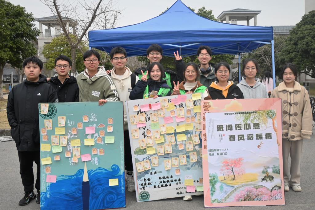 3月17日,化工学院青协的志愿者们在太阳集团2007北区榴园开展了以“纸间传心意,春风寄暖情”为主题的纸间传情活动。在同学们的积极参与中,活动圆满举办。