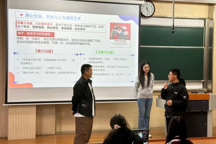 在互动环节中,郝林青带领学生共同进行了非暴力沟通的情景模拟实践,加深了学生对于良好沟通重要性的认知。在此基础上,郝林青分享了识别危险信号并妥善处理心理危机的关键技能,强调了理解、陪伴和支持的重要性,鼓励“健康守门员”们做有责任感的守护者,共建和谐校园环境。