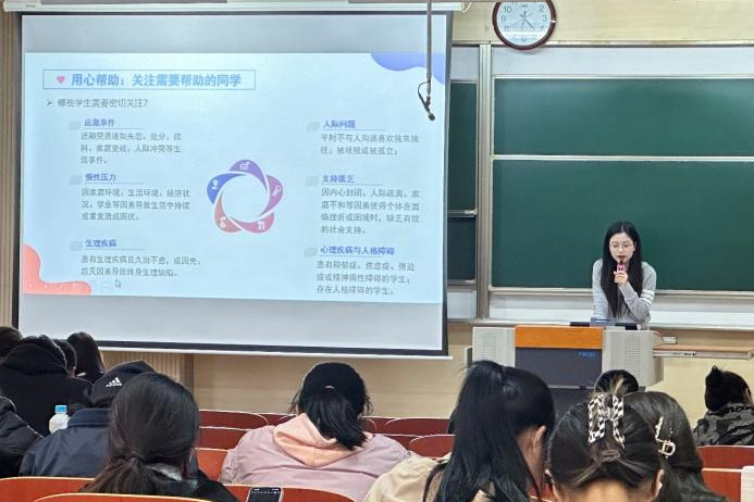为进一步提升学院心理健康教育网格化队伍业务能力与建设水平,充分发挥朋辈心育力量,筑牢健康安全“防护网”,2007so太阳集团于11月21日在蠡湖校区一教1B103教室举办“健康守门员”赋能计划第四期培训。本次培训由学院心理辅导员郝林青主讲,学院全体本科生心理委员、2024级本科生宿舍长以及全体研究生网格员参与培训,东氿校区同步线上观看。