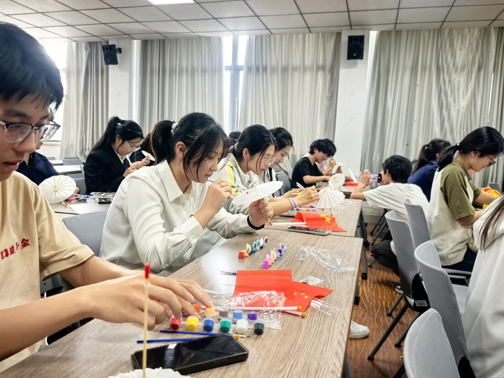 活动现场同步开展五四精神传承相关活动。张昱慧等三位同学通过诗朗诵《青春中国》抒发爱国情怀,激昂的表演引发全场共鸣;在知识竞答环节,青年学子展现出扎实的理论素养;特色创意环节中,同学们以五四精神为主题进行油纸伞创作,通过艺术形式深化对红色基因的理解。活动在全体团员青年重温入团誓词以及与团旗合影的庄严仪式中圆满落幕。