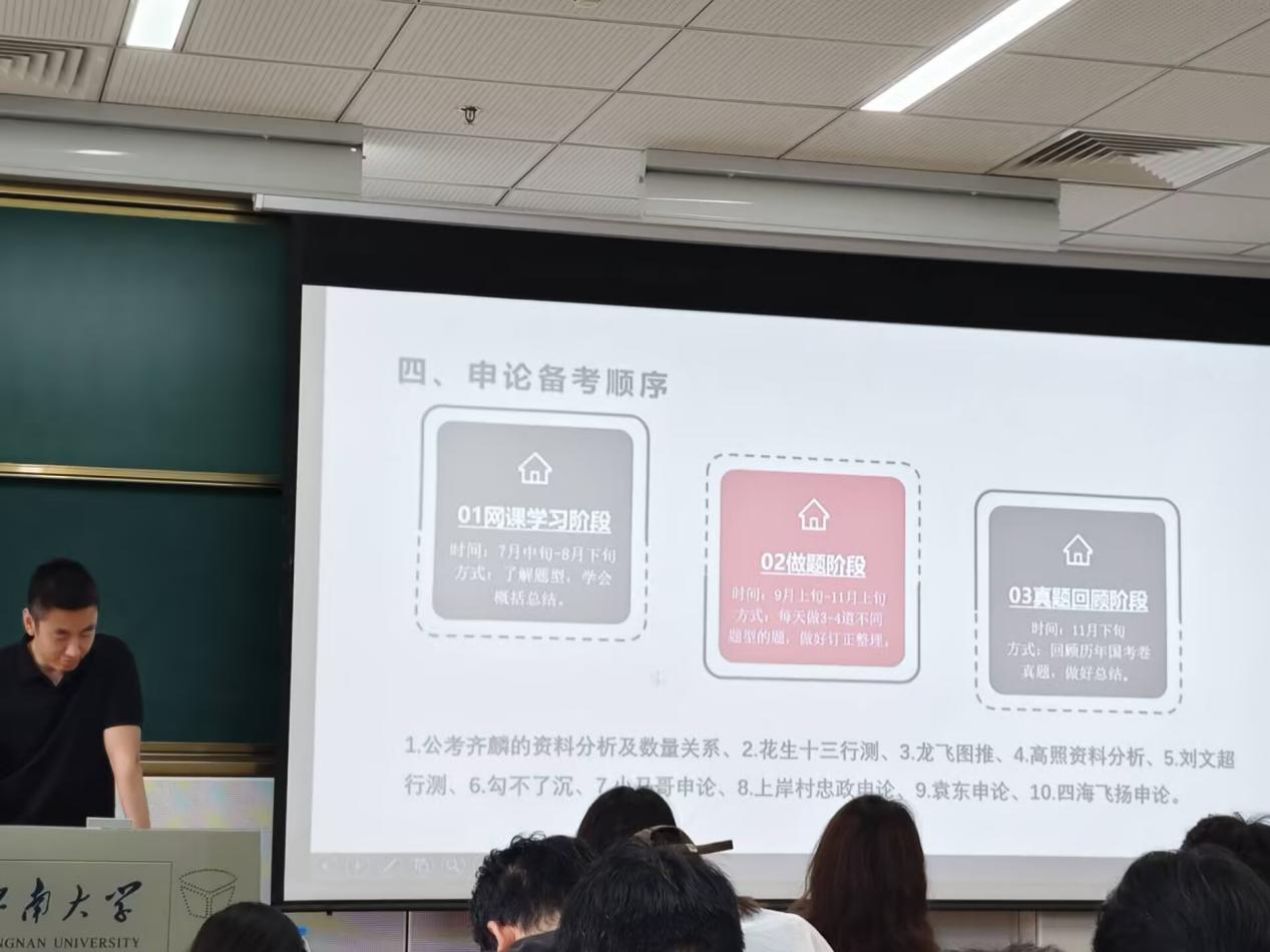 为助力学生明确考公考编方向,掌握上岸技巧,5月27日,2007so太阳集团“化山论见之职引未来系列活动”第二期——“上岸攻略”考公考编专场讲座在东氿校区知行楼 C102 顺利举行。