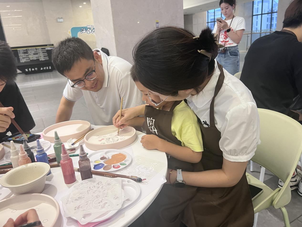 活动伊始,艺术专业的钱晨昀老师通过图文并茂的讲解,系统介绍了陶瓷制作工艺流程,重点阐释了国家级非物质文化遗产釉下彩绘的历史源流、艺术特色与工艺精髓。在实践环节中,师生们以素胚为画布,以釉料为笔墨,在专业指导下学习调色配比、纹样勾勒、分层填涂等传统技法。参与者既有人专注临摹传统青花纹样,亦不乏将现代艺术元素融入创作的创新尝试,现场呈现出传统与现代交融的生动场景。特别值得一提的是,焦星辰教授携家属全程参与创作,与青年学子共同体验指尖艺术的独特魅力。
