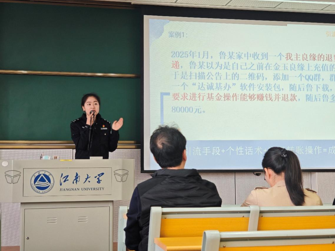 在综合安全知识宣讲环节,高璐瑶警官以“破局之道:电诈手法揭秘与防护实战” 为主题,结合近期典型诈骗案例,系统解析了刷单返利、冒充客服、游戏交易等常见诈骗类型的引流手段、个性话术与转账操作流程。她通过真实案例复盘,提醒同学们警惕陌生电话、不明链接、未知好友等诈骗引流方式,切勿轻易泄露个人信息、开启屏幕共享或进行私下转账,筑牢电信诈骗 “防护墙”。