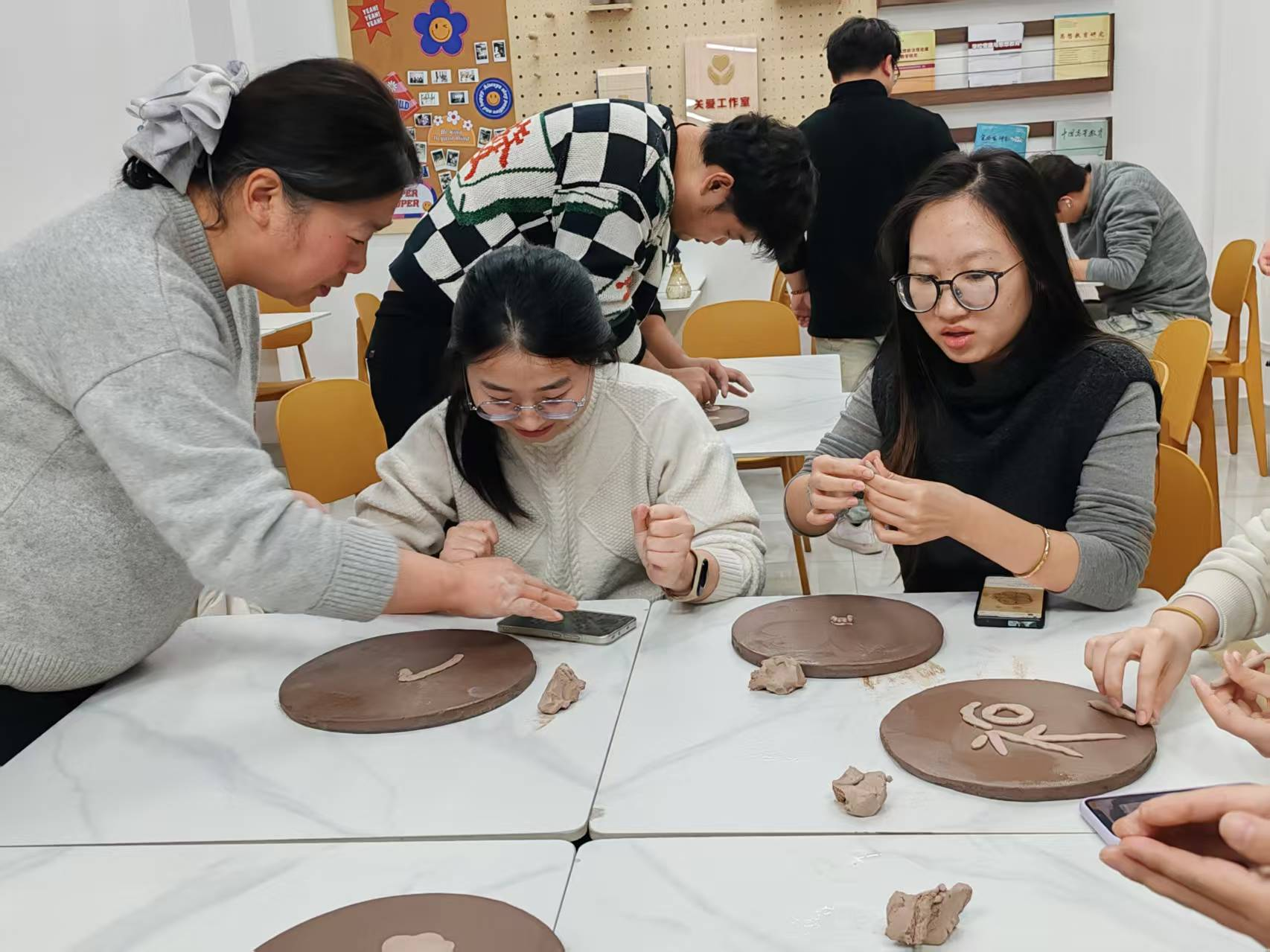 在手工陶盘制作环节,同学们亲手触摸陶土,感受其从湿润到塑形过程中的温度与质感。大家围坐一堂,一边交流制作心得,一边专注塑造手中的陶盘:有的同学以自然为题材,塑造出细腻的花草与流动的水纹;有的运用几何元素,构建出简洁而富有节奏感的装饰画面;还有的将个人情感与生活印记融入创作,使陶盘成为承载故事的独特载体。现场气氛融洽温馨,陶土在指尖慢慢“活”了起来,每一件即将成型的陶盘都凝聚着同学们的巧思与匠心。