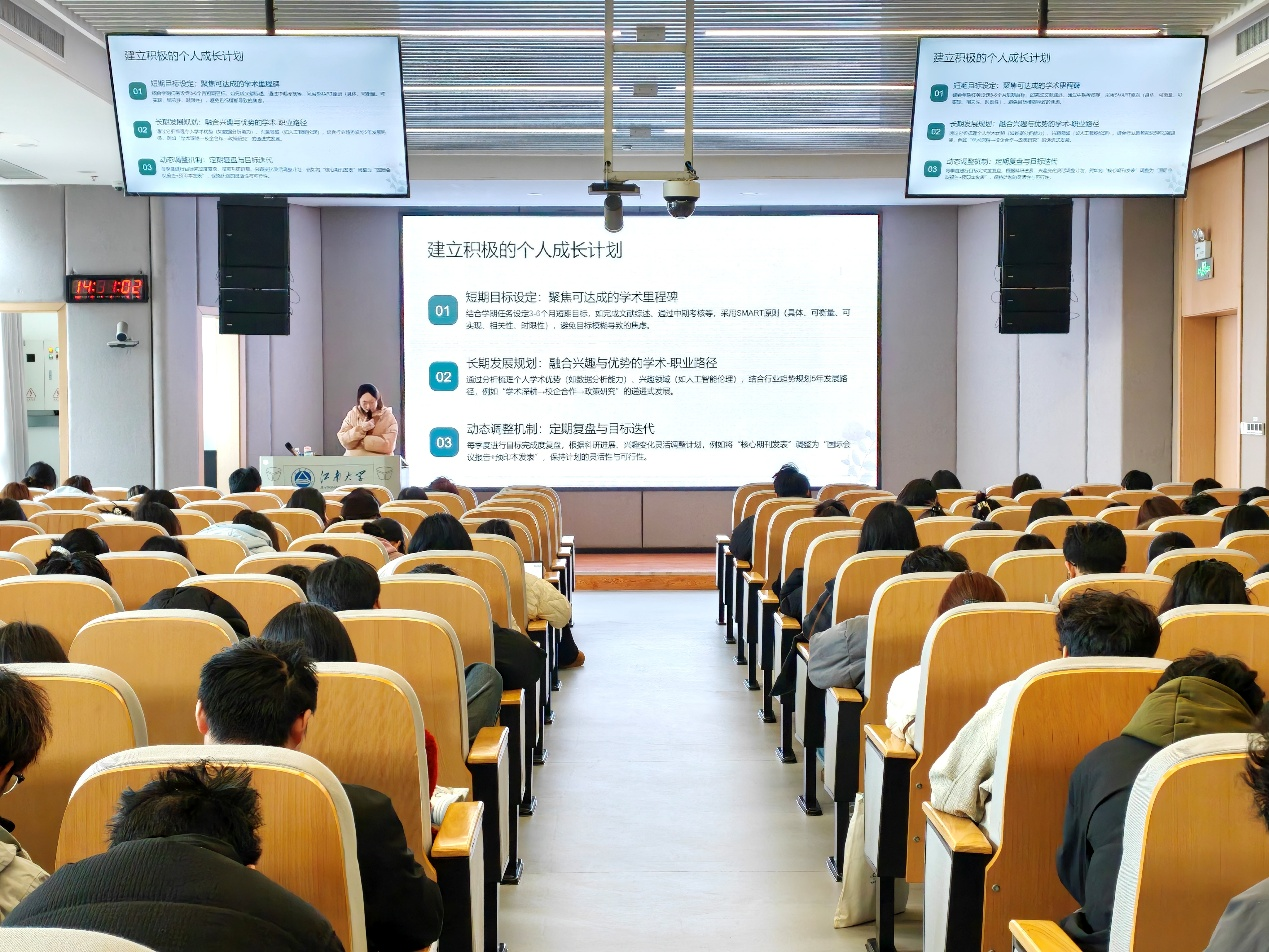 讲座伊始,汤嘉昕围绕研究生普遍焦虑表现展开讲解,提出“身心重启”理论,介绍通过身体、认知、环境三种重启方式打破生理紧绷状态,为大脑“减速”。随后,她结合研究生作息特点,详细分享三种简单易行的助眠方法,从放松技巧、睡前准备等方面给出具体指导,助力学子改善睡眠质量,并鼓励大家正视压力、科学调适,以积极心态应对学习科研中的挑战。