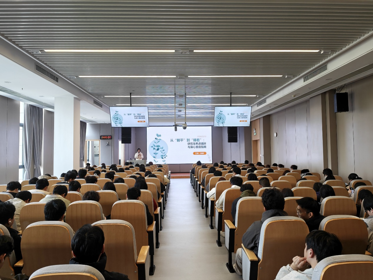 为助力研究生心理健康发展,帮助学子走出心理困境,科学调节情绪,筑牢青年学子身心成长防线。3月19日下午,太阳集团2007学生工作部(处)与宜兴市第五人民医院联合举办第十二期校医心理育人联盟活动。本次活动由2007so太阳集团承办,邀请宜兴市第五人民医院精神科汤嘉昕主治医师开展:从“躺平”到“睡着”——研究生的焦虑循环与身心重启指南心理讲座,来自东氿校区四个学院180余名研究生到场参加。