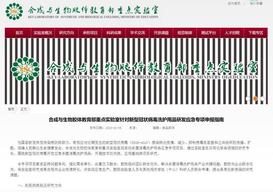 同时,加强疫情防控的科研攻关也在积极推进。合成与生物胶体教育部重点实验室根据疫情防控中亟需解决的实际问题,及时发布开放研究课题,启动杀菌消毒洗护用品应急专项,通过实验室在日用化学品领域的研究特色和专长,围绕抗击新型冠状病毒全流程开发应急杀菌消毒洗护用品,开展技术攻关类、应用基础类项目研究。截止2月16日,共收到14份来自中科院、中国科技大学和本实验室等国内知名高校及研究院所的申报简表,经专家评审遴选出5个项目重点资助。这些项目将在环境友好型杀菌消毒表面活性剂开发、安全高效消毒液开发、免洗手杀菌消毒护肤乳液开发等方向开展深入的研究与产品开发。