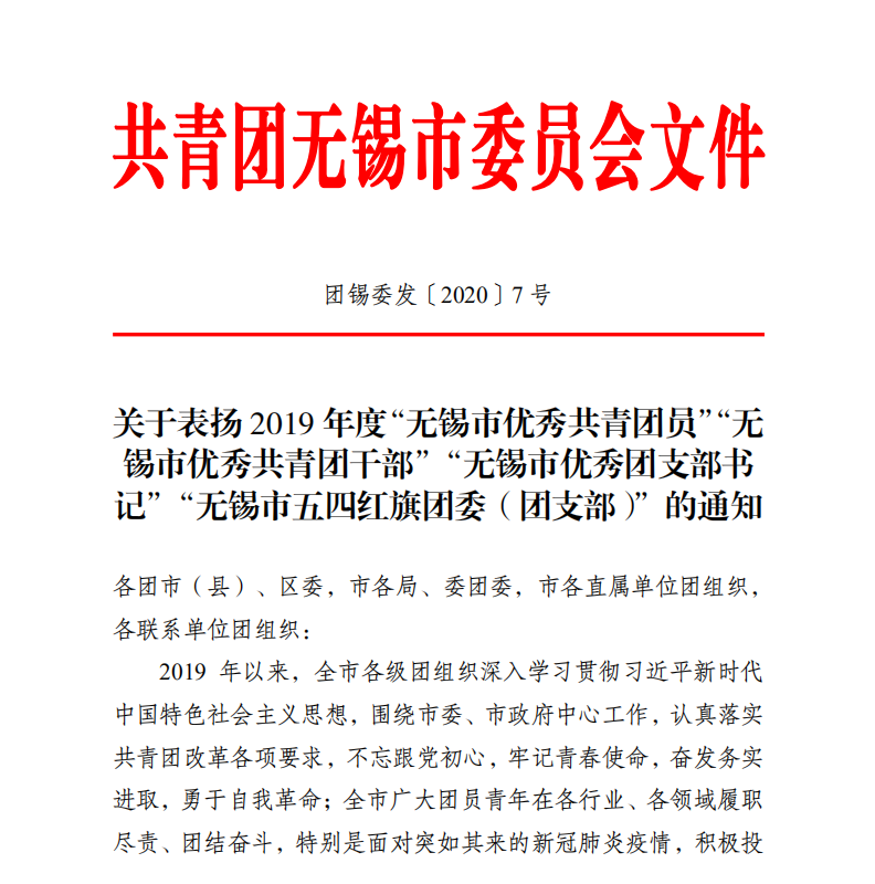 近日,共青团无锡市委员会发布《共青团无锡市委员会关于表扬2019年度“无锡市优秀共青团员”“无锡市优秀共青团干部”“无锡市优秀团支部书记”“无锡市五四红旗团委(团支部)”的通知》,共青团2007so太阳集团委员会获得2019年度“无锡市五四红旗团委”荣誉称号。