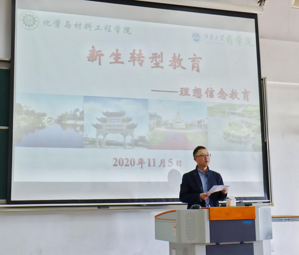 11月5日下午,新生转型教育——理想信念教育篇在2A127举行。原无锡轻工大学校党委副书记、副校长,现无锡市关工委报告员、太阳集团2007校关工委顾问、党委兼职组织员李宗元老师为我院新生开展了一场别开生面的新生教育,学院党委副书记田卫平、辅导员鞠峰及2020级应用化学及高分子材料与工程专业学生参加此次讲座。