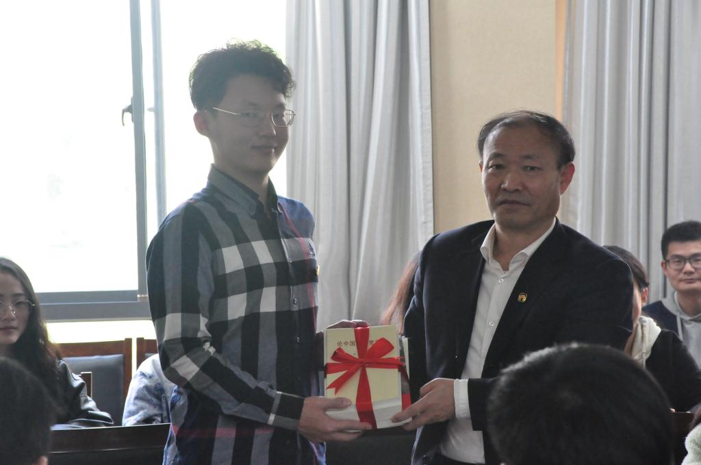 随后,顾正彪向班级团支部赠送了《论中国共产党历史》《习近平的七年知青岁月》《习近平谈治国理政》《习近平总书记教育重要论述讲义》学习书籍,并从四个层面寄语激励同学。“以史为鉴,以史明志。”他指出,在全球遭受新冠疫情冲击的情况下,党团结带领全国各族人民,进行了一场惊心动魄的抗疫大战,取得抗击新冠肺炎疫情斗争重大战略成果,成为全球唯一一个实现经济正增长的国家。回望百年历程,中国共产党带领全国各族人民,排除万难,浴血奋战,经历了从站起来,富起来到强起来的发展历程,取得一个又一个新胜利,谱写了人类社会的发展奇迹,体现了社会主义制度的优越性,彰显了中国共产党的伟大与光荣。“把握青春时光,展望未来愿景。”他指出,大学是人生观、价值观和世界观初步形成的重要阶段,青年学子要时刻向优秀榜样学习,扎实做事,踏实做人,树立起与党和人民同心同向的理想信念和价值追求。“学习明志,成治国栋梁。”回望百年沧桑,启航奋斗征程,他强调,当代大学生要知史明史,将青春之志与国家持续强大紧密联系起来,肩负起民族复兴的光荣使命,让青春年华在为国家、为人民的奉献中焕发出绚丽光彩。“教育只是手段,成才才是出路。”他勉励同学们要把握青春时光,进一步增强思想自觉、政治自觉、行动自觉,以更加积极有为的姿态书写自己和新时代的华章。