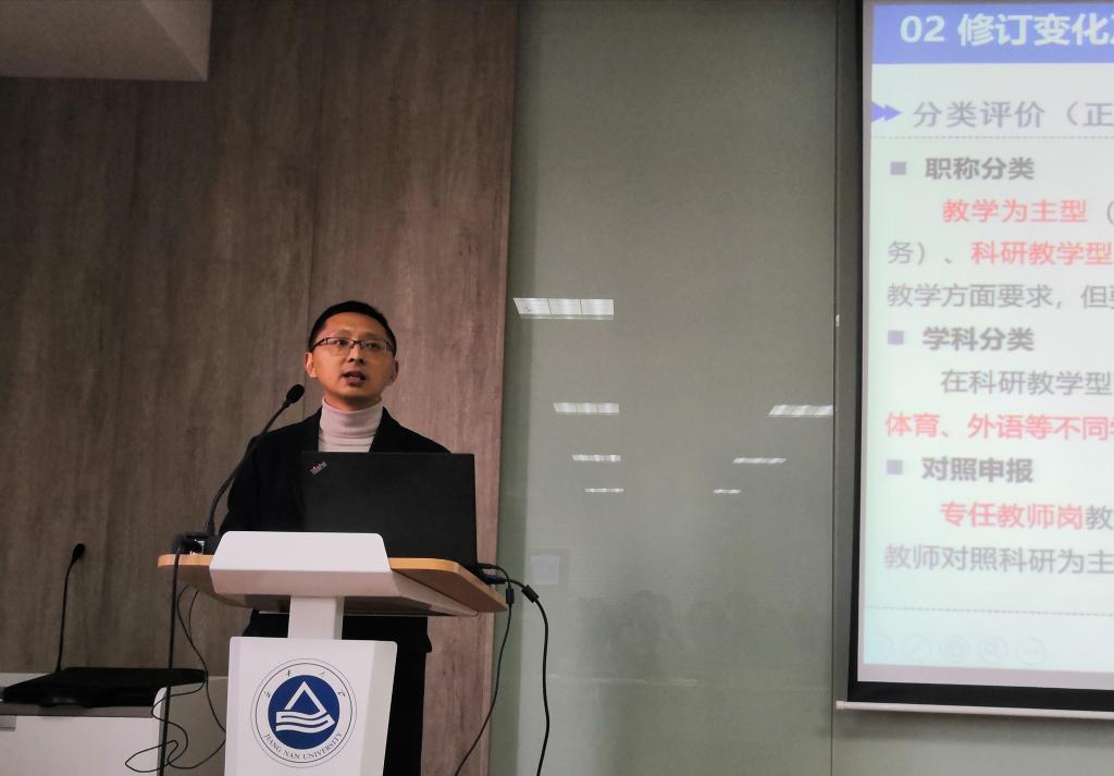 会上,陈勇结合《太阳集团2007教学(研究)系列专业技术职务任职资格申报条例》,从修订背景及其思路、修订变化及其说明、修订后新条例介绍等三个方面展开解读。同时,陈勇还介绍了包括《太阳集团2007教学科研成果支持计划管理办法》《太阳集团2007“至善教授”岗位管理办法》以及《太阳集团2007“至善青年学者支持计划”管理办法》等文件修订的情况,以及学校在教学科研方向评价上的思路和激励导向。他指出,就此次职称政策的改革在指标体系设计时始终坚持立德树人根本任务,重视分类评价设计,着力强调破除“五唯”倾向,明确教师岗位师德考核要求,进一步完善评价制度。针对职称申报的新标准、新变化和新情况,陈勇进行了重点解读,还就今后职称评审过程中的主要影响因素及注意事项,进行了细致的分析和讲解。