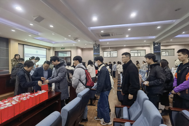 张凯老师简要介绍了定制徽章、红牛、旺仔牛奶、棒棒糖、花生糖、板栗、果冻、士力架以及班主任辅导员老师定制手写的贺卡等每一件礼品的寓意以及爱心企业赞助的护手霜、面膜、面霜、鲜奶霜等慰问品。随后,与会领导老师共同为全体同学发放了慰问品,同学们在一片欢声笑语中接过了带着学院浓浓情意暖意的礼品,与此同时他们积压的考研压力也得到了一定的缓解。