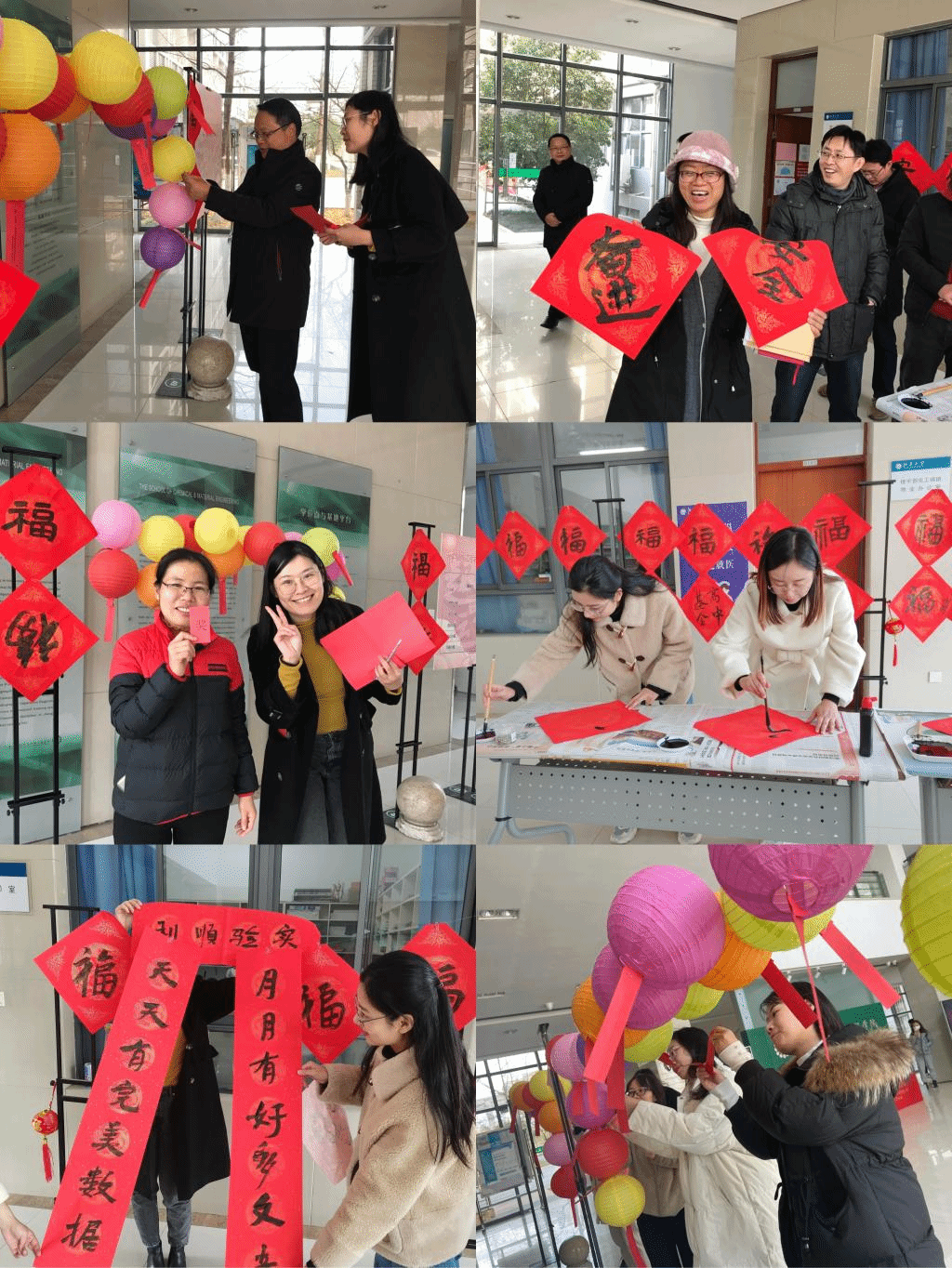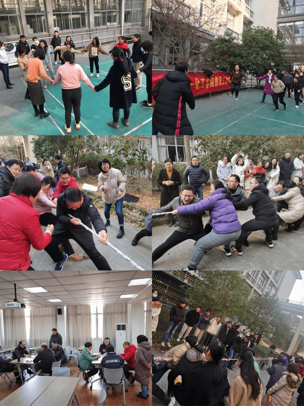 寒冷冬日、午后暖阳,学院大厅前后荡漾着欢声笑语。看,那一串串彩色灯笼摇曳出喜庆的节日气氛,那一张张福贴映照出新的一年红红火火。本次安全知识竞赛以普及安全理念、安全规范为目的,内容涵盖实验室安全、人身安全、交通安全、防诈安全等方面知识常识,通过有奖竞猜的活动形式使安全意识“内化于心、外化于行”。 活动还设置了现场书画活动,老师们可以即兴书写、定制春联,现场一片祥和欢乐的气氛。趣味运动会分为“团队跳绳”“传递呼啦圈”“拔河”“棋牌”等项目。比赛还未开始,比赛场地上已经热闹了起来,明媚的阳光为运动会现场增添了一份温暖。工作人员耐心细致地讲解了比赛规则,随后,精彩激烈的比赛正式拉开帷幕。“团队跳绳”中大家灵活的动作,展现出了教职工们良好的身体素质。“传递呼啦圈”活动展现出教职工良好的肢体协调能力。最为精彩的是“拔河”比赛,比赛开始后双方紧握长绳富有节奏的呐喊声,充斥在赛场上空。在胜负难分的时刻,队员们毫不退却,咬紧牙关,不到最后决不放弃。赛场上,参赛队员相互鼓励、协调配合,凸显了良好的团队协作能力,展现出拼搏不息、勇往直前、永不放弃的体育精神;赛场下,观众们为运动员呐喊助威,欢呼声萦绕耳畔,久久不能散去。