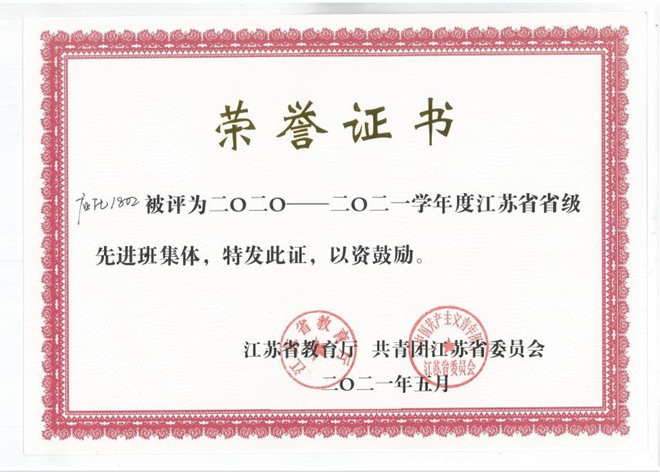应化1802班“江苏省省级先进班集体”荣誉证书