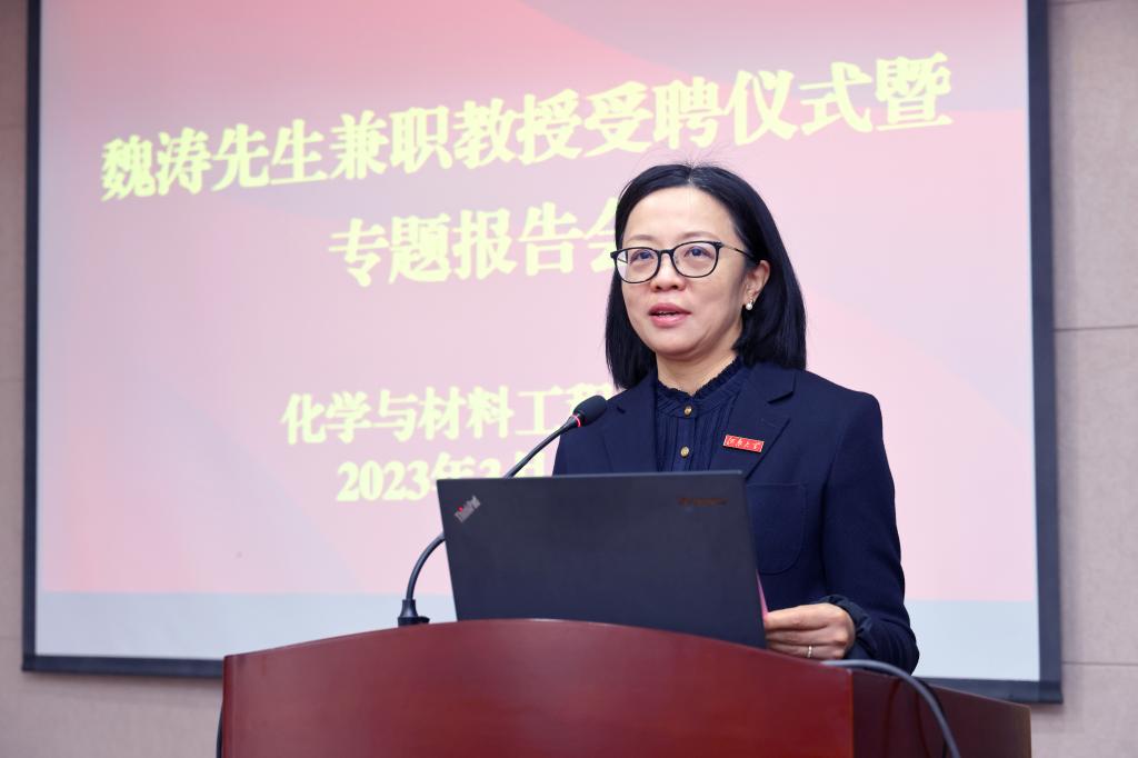 张影陆指出,化工学院聚焦日化行业,积极开展高水平基础理论研究、重大创新技术研发和产业化应用,在人才培养、学科建设、科学研究等方面为推动学校事业发展作出了积极的贡献,希望魏涛教授的受聘能为我校在科学技术研究、人才队伍建设、平台运行与管理等方面提供宝贵经验,提高学院在学术研究水平、培育标志性成果、培养高层次人才等方面的工作质量,提升我校在胶体与界面化学研究方面的影响力,为学科建设和发展提供更多的支持和帮助!同时也希望师生好好把握学习机会,努力提高自身的研究水平和学习能力,进一步为学校的建设贡献自己的力量。魏涛教授表示能相逢在美丽的江南非常高兴,很荣幸成为化工学院的一员,他将在以后的工作中与学校、学院紧密合作,带领团队致力于胶体与界面化学领域的研究,努力提升我校化学化工学科影响力。