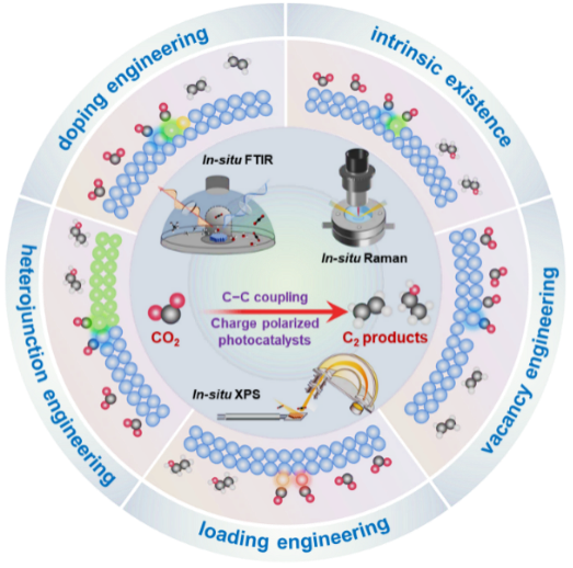 图2:CO2在电荷极化光催化剂上对C2产物进行光还原的过程,其中通过不同策略设计电荷极化活性位点促进C-C偶联,以及用于识别活性位点和检测反应性中间体的原位表征技术。