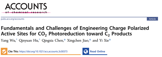 近期,焦星辰教授、陈庆霞副教授与中国科学技术大学谢毅院士合作,在光还原CO2催化剂材料设计方面发表重要综述论文,相关工作在化学三大综述期刊之一“Accounts of Chemical Research”上发表:“Fundamentals and Challenges of Engineering Charge Polarized Active Sites for CO2Photoreduction towards C2Products”。Accounts of Chemical Research是美国化学会旗下的国际著名期刊,是国际上最具权威性的综述性期刊之一,旨在介绍化学、生物化学、材料科学、纳米科学等相关研究领域的最新研究进展。该刊物不同于一般的综述性期刊,它具有鲜明的“自我综述”的特色,主要是描述通讯作者自己的系统性研究工作,并且要对该领域的未来发展方向给出视野独特、具有前瞻性的展望。在Accounts of Chemical Research上发表学术论文,是作者所开展的研究工作具有系统性、创新性和重要国际影响力的标志之一。这是我院以第一单位在此期刊发表的首篇论文,论文第一作者为中国科学技术大学博士生吴洋和太阳集团2007硕士生胡秦源。