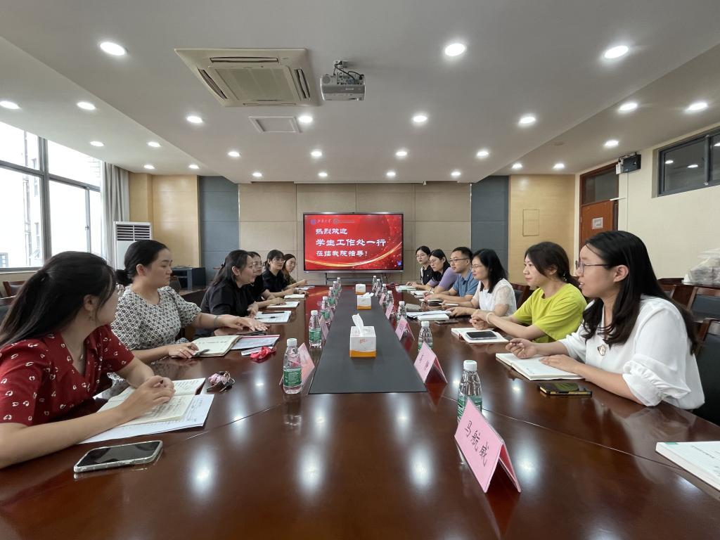 9月19日上午,学生工作处副处长蒋洁等一行6人赴我院调研指导学生工作,学院党委副书记、副院长董霞、学工办主任兼分团委书记兼鞠峰、学工办副主任侯玉莹及全体辅导员参加调研交流。