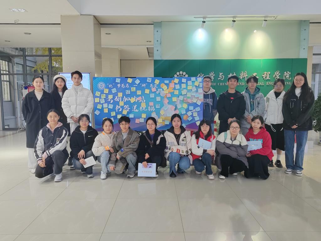会前,老师和同学们准备充分,精心布置场地、准备礼包,同学们在明信片上写下祝福,为考研学子加油鼓劲,表达最诚挚的祝愿:“千淘万漉虽辛苦,吹尽狂沙始到金”、“星光不问赶路人,我们一‘研’为定”、“念念不忘,必有回响,此战必胜,金榜题名”……一字一句满载真心,一笔一划勾勒愿景。考研之路漫漫,衷心的祝福陪伴学子不断前行,化工楼大厅布置“化”梦为马,一“研”为定祝福展板,来往同学及工作人员们手写便利贴,为考研学子加油助力,五颜六色的便签承载着学院师生的期愿,一份祝福一份温情,化成冬日的柔柔暖意。行程万里,温暖相伴,这一路虽日夜兼程,化工学院大家庭永远是莘莘学子坚实的后盾。