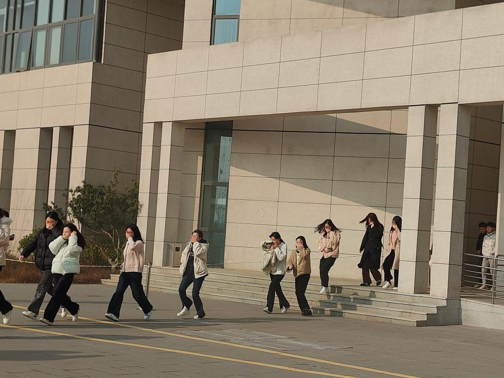 下午14:00,随着知行楼烟幕弹释放,应急逃生演练开始。实验楼各楼层火灾警示广播声响起,实验室内学生迅速停下工作,井然有序地撤离到一楼指定疏散集合点,清点人数后集体步行前往南门大停车场,与环境与生态学院师生汇合后共同进行后续消防演练。活动现场,主持人张一波简要介绍应急演练活动的主要内容,并介绍到场的领导和嘉宾。赵爱军发表讲话,他强调,安全是学校一切工作的“压舱石”,而实验室安全是校园安全的重要组成部分,广大师生要长鸣安全警铃,提高安全意识,掌握应急技能,牢守安全底线。随后,顾志国宣布应急演练正式启动。