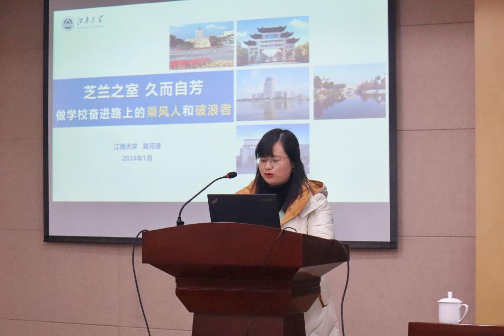 1月2日下午,校党委副书记戴月波以“芝兰之室,久而自芳,做学校奋进路上的乘风人和破浪者”为主题,为化工学院本科2022级应化、材料系学生讲授思想政治课。化工学院党委副书记、副院长董霞主持。