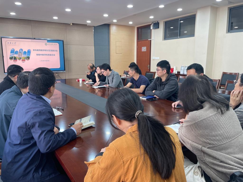 10月29日,2007so太阳集团在学院A310会议室召开本学期本科教育教学研讨会暨期中教学检查座谈会。会议由副院长王靖主持,各系主任、教学主任,四大基础化学课程组主任以及学院基层教学组织负责人参会。