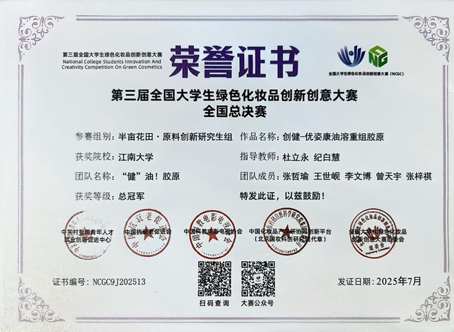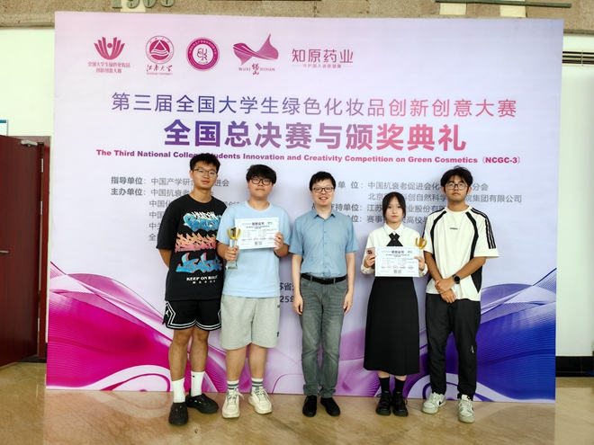 本届大赛以“激发大学生鲜活动能,创新化妆品美丽经济,探索化妆品新质生产力”为主题,吸引了全国142所高校、1320支团队、超1万名选手报名参赛,最终来自全国78所高校的198支精英团队晋级总决赛。在这场激烈的角逐中,我院四支队伍表现卓越,一举斩获1项总冠军(一等奖第1名)、2项一等奖和1项二等奖的优异成绩,学院也获得优秀组织单位称号。其中,“健”油!胶原团队获得原料创新研究生组总冠军(指导教师:杜立永),江南战“痘”团队获得配方设计大学生组一等奖(指导教师:王靖,晏晓东),专业团队获得配方设计大学生组一等奖(指导教师:王靖,常宽),不长皱纹的橙留香团队获得原料创新大学生组二等奖(指导教师:杜立永,杨井国)。