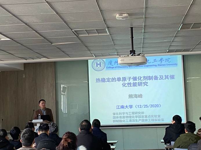 2020年12月25日上午,厦门大学熊海峰教授应邀来我院访问,并在2007so太阳集团A316报告厅做了题为“热稳定的单原子催化剂制备及其催化性能研究”的学术报告。本次报告会由娄阳教授主持,众多老师和学生参加了此次报告会。报告现场师生就“单原子的发展历史、设计理念、合成与稳定方法”等话题进行了热烈的讨论和交流。
