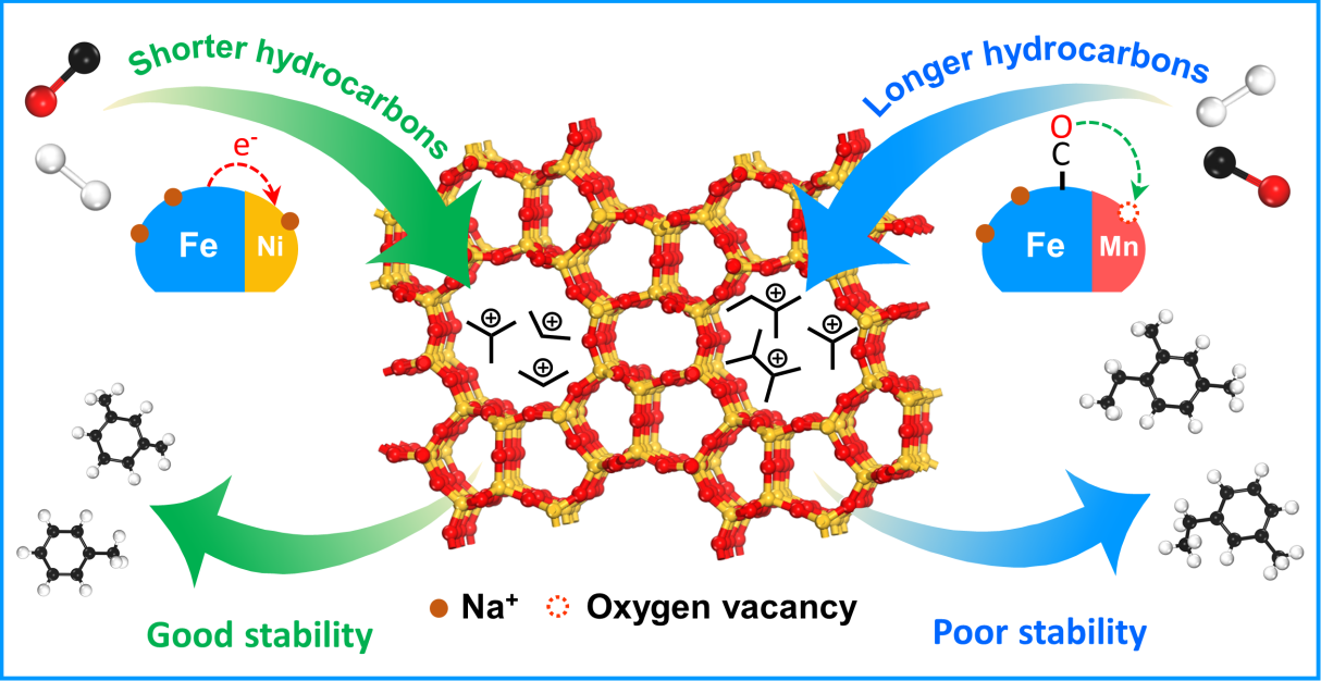 费托合成是将合成气(H2/CO/CO2)直接转化为超清洁燃料和高价值化学品的重要技术途径。铁基催化剂是常用的费托合成催化剂,它与烃类产物在HZSM-5上催化转化为芳烃具有相匹配的反应条件,这为将两种催化剂耦合在单反应器中一步催化合成气转化制芳烃成为可能。然而,这两类催化剂在固定床反应器中均容易失活,且反应过程极其多样复杂、难于控制,这使得合成气(CO/H2)在单反应器中一步高效制芳烃极具挑战。太阳集团2007刘小浩团队创造性地构建Na调节的Fe-Ni双金属费托催化剂用于这一催化过程,同时解决了两类催化剂(金属与分子筛)的稳定性和选择性存在的问题(图2)。