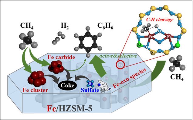 一直以来,CH4无氧芳构化反应主要围绕着钼基分子筛催化剂开展研究,其他过渡金属如铁等作为活性组分普遍被认为具有很低的活性和芳烃选择性。然而,我校化工学院刘小浩团队基于对CH4分子中C-H键可控活化机制的认识和理解,通过调控Fe物种在HZSM-5分子筛中的存在形式,实现了CH4分子的可控活化,高效转化生成芳烃。实验和表征结果表明:Fe-oxo活性物种(含氧铁物种)对实现C-H键的可控活化起关键作用。比较而言,金属铁或碳化铁物种能使CH4分子深度脱氢,生成积碳,减少目标产物芳烃的生成。有趣的是,尽管该项研究使用含硫的二价铁前驱体(FeSO4)经离子交换形成活性中心,然而残存的硫(S)并没有因其提升C-H键活化而影响目标产物芳烃的生成。
