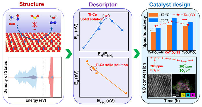 工业废气和机动车尾气排放的氮氧化物(NOx)是大气中细颗粒物(PM2.5)的主要前体物之一,还可产生光化学烟雾和硝酸型酸雨,严重危害人类生命健康和破坏生态环境。我国十四五规划提出了将NOx排放总量减少10% 以上的减排目标。开发高效NOx催化净化(脱硝)催化剂是实现NOx减排的关键技术问题。在本项研究中,刘冰副教授与刘小浩教授采用“DFT理论计算指导催化剂结构设计的研究手段(图1),从原子水平上精确调控稀土二氧化铈(CeO2)的表面结构,获得了高活性、高耐硫性的Ce-Ti固溶体低温脱硝催化剂。通过综合分析DFT计算与实验结果,归纳出EH/ENH3Evac是控制Ce-Ti催化剂活性的反应描述符Ce-Ti固溶体结构的高活性源于其适中的EH/ENH3Evac值。Ce-Ti固溶体中Ti位点特殊的几何结构和电子结构使其扮演着SO2捕获位点的作用,从而有效保护催化活性中心。该项研究为设计高活性、高耐硫性稀土铈基低温脱硝催化剂提供了新的认识和理论基础(图2)。研究工作得到了国家自然科学基金(21802054, 21878127)、江苏省自然科学基金(BK20180587)和内蒙古自治区关键技术攻关计划(2019GG321)等项目的资助。