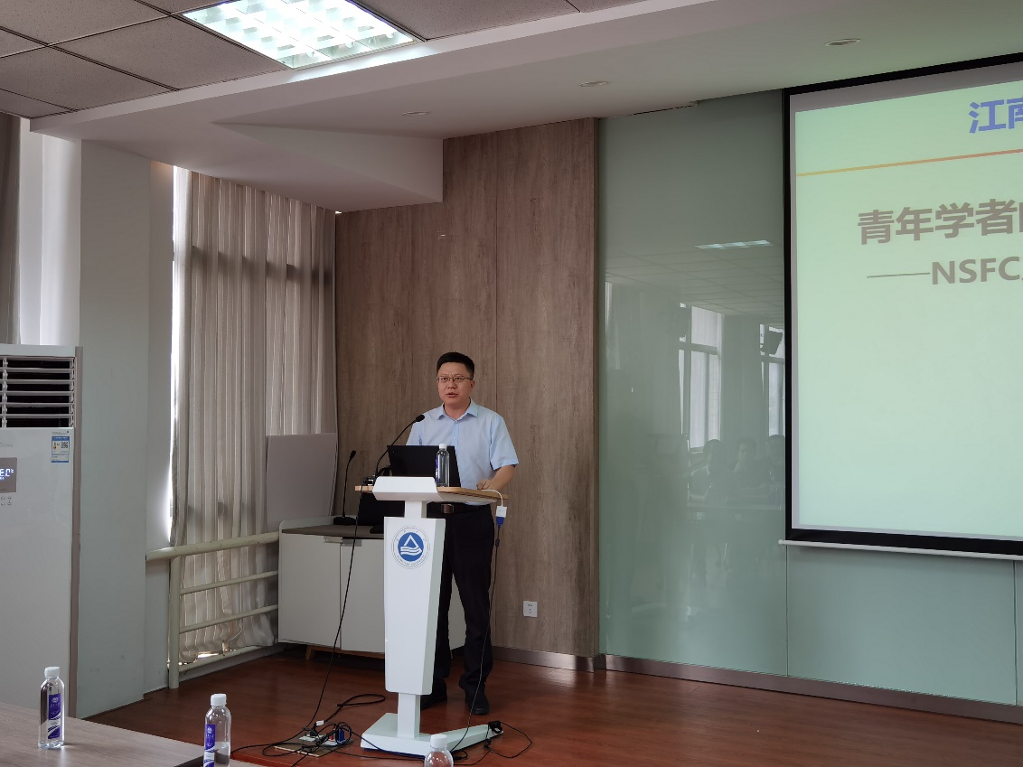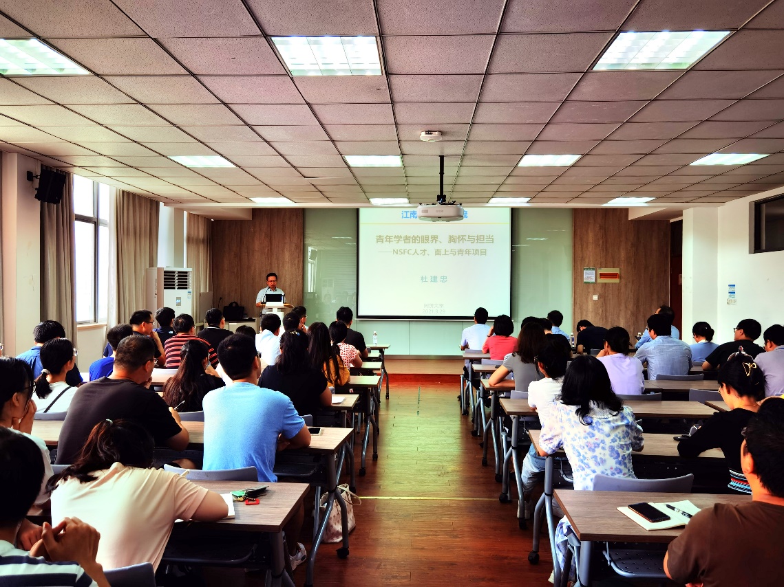 报告会上,东为富院长对杜建忠教授进行了介绍,并对杜教授的来访致以热烈的欢迎和衷心的感谢。杜教授首先介绍了国家杰出青年科学基金和优秀青年科学基金项目,指出杰出青年项目是十年磨一剑的学术积累,深入分析了时代需要什么样的青年学者。接着,杜教授重点介绍了国家自然科学基金的申报工作,全面细致地分析了国家自然科学基金的特点、评阅流程、撰写要点的建议,最后对申报过程中出现的常见问题进行了深入的剖析。杜教授高瞻远瞩的视野和具有丰富内涵的报告内容,使得在场教师和研究生受益匪浅,感受颇深。
