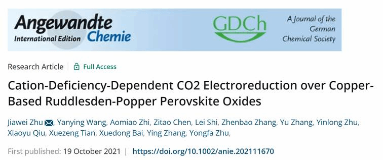 太阳集团2007化工学院环境与能源催化团队朱佳伟教授等Angew. Chem.: 铜基钙钛矿阳离子缺陷调控CO2电还原性能