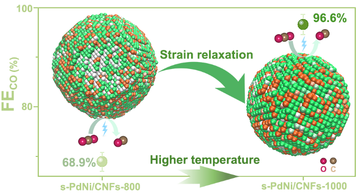 针对以上问题,课题组利用静电纺丝纳米纤维作为纳米反应器(ACS Nano 2022, 16, 2, 3251–3263,图2,第一作者为我校2018级博士研究生郝继灿和清华大学庄泽超博士),制备了一系列具有应变效应的双金属纳米合金催化剂(MNi,M =Pd,Ag and Au)用于电催化还原二氧化碳反应(CO2RR)。利用分子动力学模拟(MD)提出高温活化能的调节能够精准调控PdNi合金的表面应变的新概念,结合DFT计算进一步证实应变工程对于调控合金催化剂的电子结构起到关键作用,从而建立起应变与CO2RR催化活性及选择性之间的构效关系。基于理论计算,利用静电纺丝纳米纤维高温条件下产生的限域作用,制备得到一系列具有应变效应的高效CO2RR合金催化剂(PdNi,AgNi以及AuNi),PdNi合金CO法拉第效率(FECO)达96.6%,结合原位表征技术(原位拉曼,原位红外)进一步证实应变的调节能够优化反应中间体*COOH及*CO的结合能。该方法为催化剂设计提供了一条很有前途的途径,能够独立优化反应中间体的生成能,同时提高催化活性和选择性。