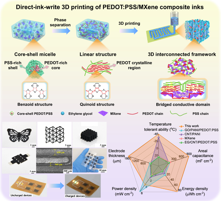 图1. 3D打印PEDOT:PSS/MXene凝胶复合材料及微型超级电容器