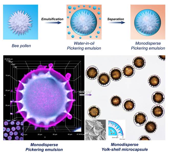 本次采访报道主要涉及一种以均一的天然蜂花粉为水相核心模板制备单分散Pickering乳液的全新方法,即在乳化均质过程中添加花粉微粒便能制备分离出尺寸均一的Pickering乳滴。同时,利用溶胶-凝胶法可在单分散Pickering乳液的基础上制备单分散Yolk-Shell微胶囊,实现了活性物质的双层封装和保护,为探索单分散Pickering乳液和微胶囊的研究提供了崭新的研究思路。